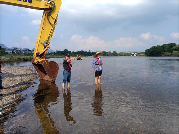 因淤積量大,經讨論研究确定“先通後暢”施工方案,即在當天先挖出一條能保證船舶通行的應急航道,之後再按照Ⅶ級航道維護尺度标準要求進行疏浚完善。随後,廣西港航03205運載船裝載挖掘機趕到現場,在完成航道測量、抛設施工标志等工前工作後,17:05,挖掘機正式開展桃花灘應急搶通疏浚施工。19:30,應急航道疏通完成,目前正在按Ⅶ級航道維護尺度标準繼續搶通施工中。