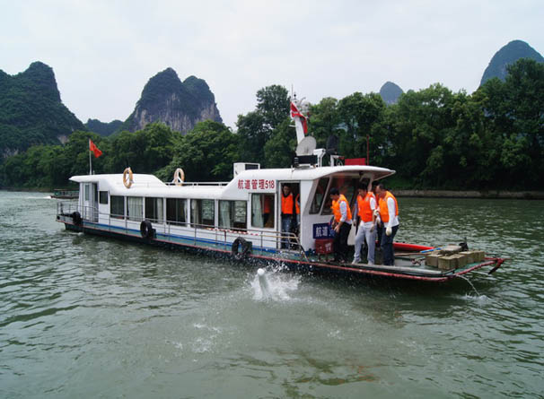 自4月份以來,桂林地區雨水偏多且量較大,且上遊來水補充,漓江水位上漲迅猛。大量的雜草、樹枝、塑料篷布等漂浮物随着水流而下,這些漂浮物纏、卡在浮标錨鍊上易造成浮标移位失常,加上夜航旅遊船舶偏離航道行駛可能會對标志造成毀損。該局把做好汛期安全生産工作作為當前各項工作的重中之重,為保證所轄水域浮标準确到位、正常運行,日前專門開展了标志更換工作,共出動人員13名,調配工作船艇4艘,分成兩個小組,将漓江22座PE浮标更換成鋼質浮标,同時對太陽能闆、燈器進行了改換、維護,确保汛期航道标志正常運行。