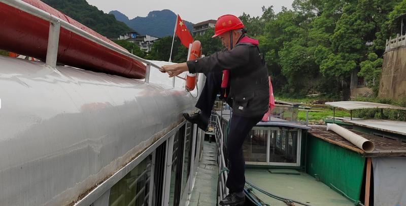 桂林4月到8月是汛期,5到6月是主汛期,現在4月下旬了,洪水随時都可能暴發,而且漓江洪水來得特别快、特别急,我們正在抓緊時間加固航标、清理纏繞在航标上的垃圾,不然等洪水來了,航标就會被垃圾拖離損毀。”看着窗外傾盆大雨,當日正好輪到周文在船值班,他一邊說一邊警惕地盯着河面水流。作為有着幾十年水上工作經驗的航标員,已經記不清楚大大小小經曆了多少次洪水,因此,每當這個時候,他都高度警惕、如臨大敵,安全問題容不得一絲馬虎。